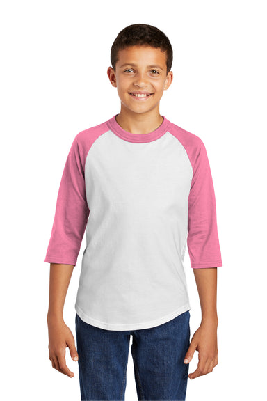 Sport-Tek Youth 3/4 Sleeve Crewneck T-Shirt - White/Bright Pink