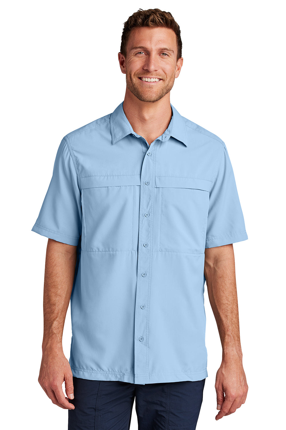 Port Authority Mens Daybreak Moisture Wicking Short Sleeve Button Down Shirt w/ Double Pockets - Light Blue