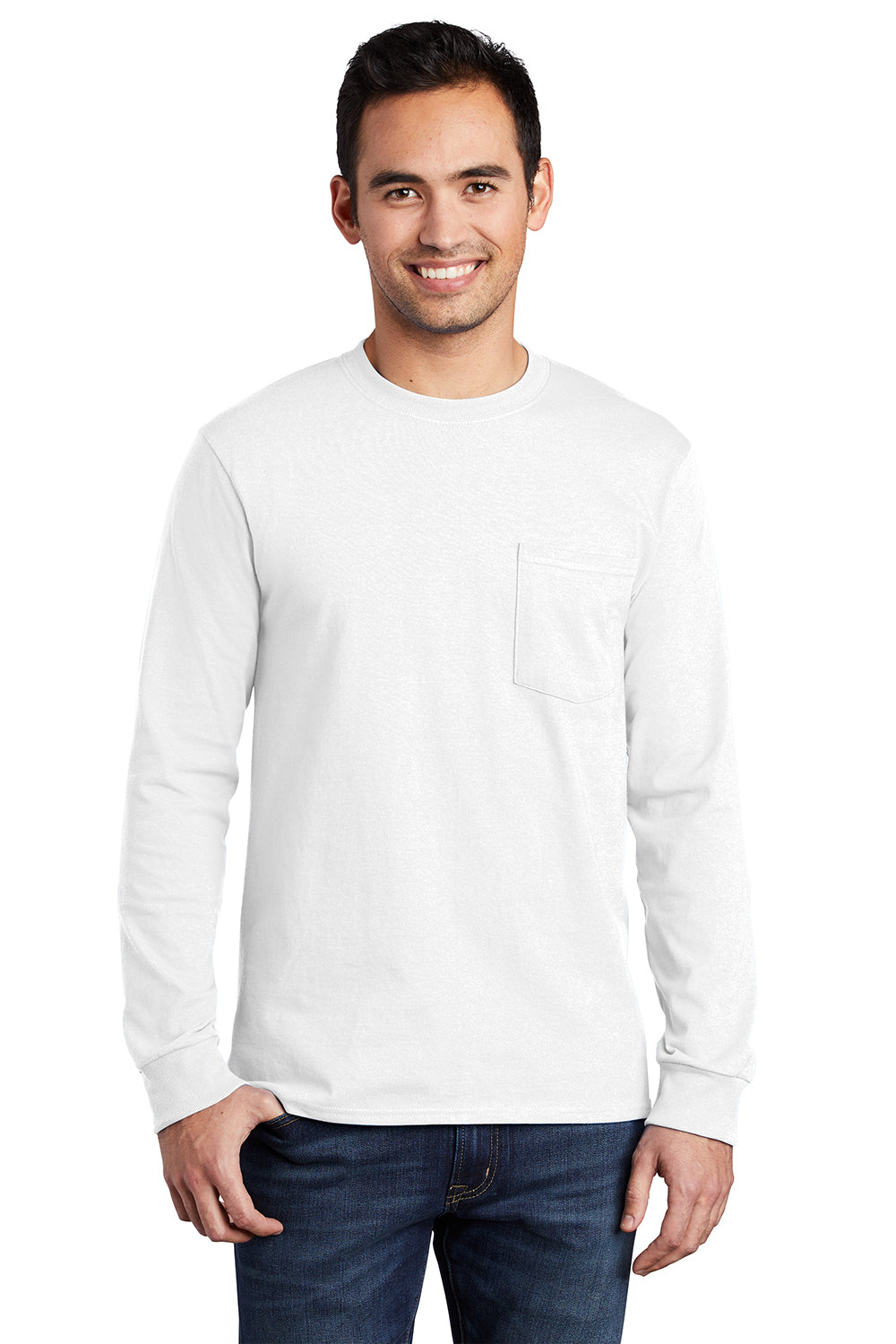 Port & Company Mens Essential Long Sleeve Crewneck T-Shirt w/ Pocket - White